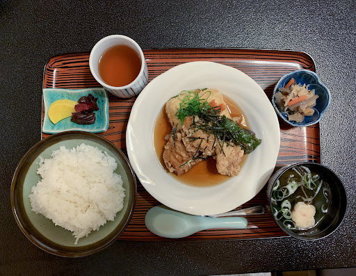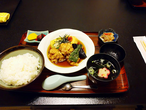 I got the fried chicken set meal and a serving of their popular agedashi tofu. Flavor-wise, the fried chicken is good, but I've had better; however, the way it was fried is amazing, the light, crispiness of the outside and the juiciness of the meat is really hard to beat. The rest of the set includes, rice, miso soup, pickles, and a small side dish, and were all good. The agedashi tofu, like the fried chicken, was expertly fried, and was really fluffy in the middle, and went really well with the dashi it came in. It's a nice touch that the set includes a small coffee at the end of the meal. The restaurant has a traditional Japanese interior, and has a nice, calm, comfortable and unobtrusive atmosphere, much like the staff and the service. Prices are reasonable, and I like that they have add-ons to supplement sets. Everything is freshly made to order, so there is a little wait for the food to be prepared. Before, I was frequenting a chain shokudo (canteen restaurant), but after discovering this place, where the food is freshly prepared and delicious, I'll be coming...