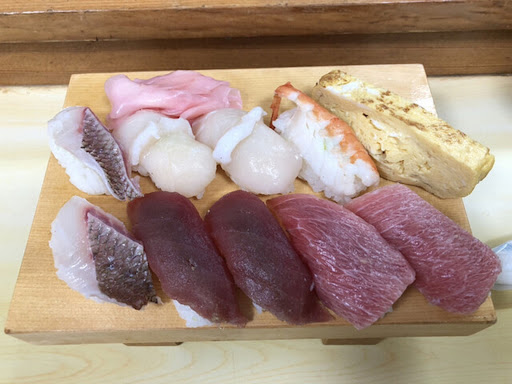 ネタ、シャリ共にやや大き目の握り11~12貫と茶碗蒸し、汁物が付いて税込み1,000円。ただ安いだけでなく、握りもほぐれないようにしっかり握られており、酢飯も上々。 ネタはマグロ、アジ、エビ、イカ、ホタテなどが中心で、100円回転寿司とは比較にならない品質の、旬のものを握ってくれる。
