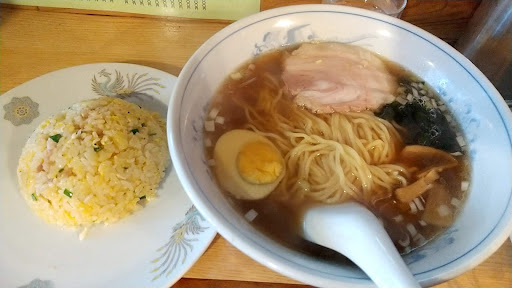 チャーハンと餃子を注文。 食べログには駐車場有りとあるが、ないとのこと。 優しそうな女将さんと、鍋を振るご主人は息子さんだろうか。仲良さそうに話しながら、常連にも声を掛けている。近所への出前も忙しそうだ。 チャーハンの盛りは少なめでご飯がかなり柔らかく、フワフワな食感。ベタベタはしておらずパラパラの対極というところか。スープはしっかりと美味い。 餃子は細長い形で6個、あんは野菜中心で少なめ。 残念ながら今日の2品は自分の好みに合わなかったが、こんなにアットホームで、安く、地元に愛される町中華は今や貴重。いつまで...