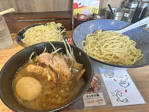 つけ麺はツヤツヤしてるコシのある太麺。 食べ応え抜群です。 それと野菜トッピングおすすめです。 麺と野菜にたっぷりつけ汁絡めて食べると最高です。あと辛いの平気なら卓上の七味も使った方がさらに美味いです。