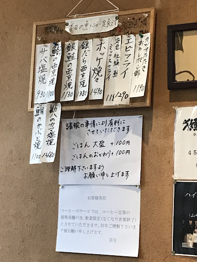 Read more数年前に一度来店していましたが、久しぶりにランチに訪れてみました。 ランチ時でお客様で賑わっておりました。 焼き魚やとんかつやフライ系もあり、お手頃価格が嬉しい。 900円の鯖の塩焼き定食を注文。 大きめな鯖はアブラも乗って美味しい。 お魚の質も良いし、きちんとした和食屋さんである。 ご飯も程よい炊き加減も良し、 小鉢も付いてとても満足感がある。 接客も女性がきちんとお客様の様子を伺いながら、テキパキと動いている。 とても好感が持てるお店であります。 最後にデミタスコーヒーも付きます。 夜の部もそんなに高価な気取った価格ではないようです。 もっと頻繁に通うべきでした。 ま...