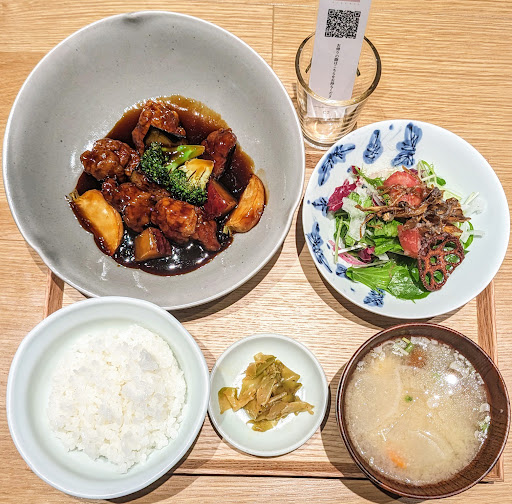 「希須林」と言えば担々麺ということで、ランチでも担々麺が圧倒的人気メニューだが、辛いのが苦手なので「黒酢の酢豚ランチ」1,780円をオーダー。 サラダ・ザーサイ・ご飯・味噌汁付。 メインの黒酢酢豚は、見た目は美味しそうなのだが、麻布台ヒルズマーケットにある「富麗華キッチン」の「“名物”黒酢の酢豚セット」1,980円と比較すると、率直に言って美味しくない。 さつまいも・かぶ・ブロッコリー・なすといった揚げ野菜も入っているので、食べていて飽きないのだが、肝心の豚肉はジューシーさや旨味が無くスカスカ。 黒酢ソースは、肯定的に言えば、あっさりしていて酸味や甘みは穏やか。 否定的に言うと、コクが無く、味に深みも無く、具材と絡んでも美味しく感じられず…。 艶々のご飯や具沢山の味噌汁とサラダは良質なので余計に残念。