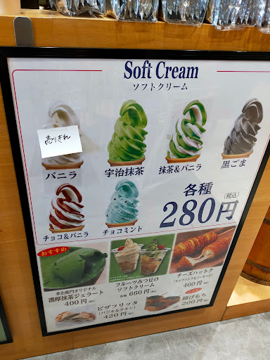 ソフトクリームの機械は見える限り一つしかなく小さいものだったけど、メニューには10種類くらいあってどうやって出し分けてるのか謎でした。
