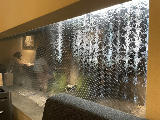 店内入るとガラス張りの厨房併設の販売スペースあり、若い職人さんが和菓子を作っている様子を見ることが出来ます。店員さんに店内飲食を伝えると、イートインスペースの茶房に案内され奥へ。途中、オシャレな個室有り。壁から水が流れるオブジェ、柔らかな照明と、モダンで落ち着く茶房です(’-’*)♪