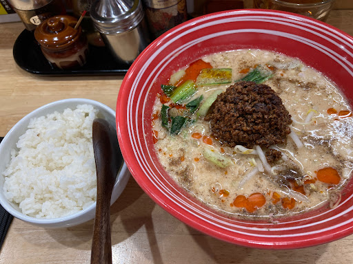 坦々麺のスープをすくって飲んでみると、花山椒や中華系のスパイスが絡み合い複雑で独特な味わい。ファーストインパクトは辛さよりも旨みが広がります。 具材が丼全体に細かく散りばめられており、もやしが入っていたり刻み玉葱が甘くシャキッとして、チンゲン菜も清涼感あり◯。 麺は中部ちぢれ麺でスープとよく絡んでいて少しモチッとした感触で美味しい。 途中で中央にある肉味噌を溶かすと、また違った辛さや濃厚な旨味が詰まっていて良い味変に。この辺りでかなりスパイシーになったので激辛が好きな方以外は辛さは弱で充分だと思います。 また、壁に貼ってある食べ方に従い卓上のネギ油を2杯入れると、香ばしさと旨味が更に追加され絶品なスープへ! 白飯は普通のお茶碗に普通盛りくらいですが、スープとの相性抜群。 卓上のゴマを入れつつ完飲完食。