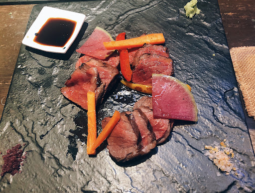 ■美蘭牛のステーキ 1600円 これはいただいておかないと! 厚めにカットされ、レア目に焼かれたステーキ。 醤油、ポン酢、岩塩、粒マスタード、わさびをお好みでつけて。