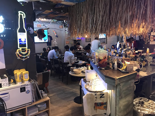 店内は南の島のビーチバーを思わせるカウンター。フロアには、ダイニングテーブル席とアンティーク調のソファ席。 入り口付近の天井を埋め尽くしたオーナーが撮影された旅の写真たち。 天井から吊り下げられた提灯。 居るだけで楽しくなる店内です。