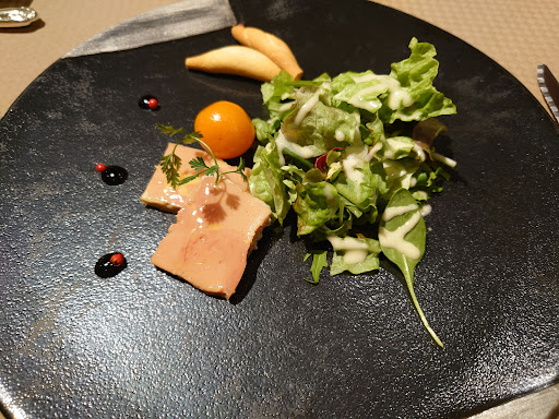前菜はさつまいもとチーズのガレット。生ハム、サラダのプレート 甘さ控えめなスイートポテトのような食感でかなり大きめで食べ応えあり。