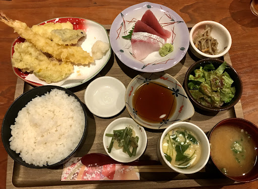 この日はお造りと天ぷらがある定食にしました。1,210円(税込) 期待してなかったけど、お造りはそこそこ良かった。 ドリンク付きで、玄関にあるコーヒー、お茶は飲み放題。 ================= 2021年4月平日ランチ
