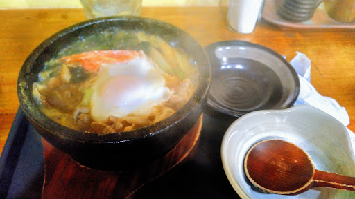 (2023年7月追記) 鍋焼きうどん味噌風味を注文。 石焼きの器にグラグラ煮立てて出てきた。 真夏日で猛烈に暑い時であったが具も海老、貝、豚肉、たっぷりの野菜、玉子と盛りだくさん、うどんも味がよく染みて旨かった。 おたふくオムレツも相変わらずふわとろで...