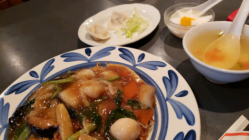 Read more駅近、ボリューム感ある中華やさん、 ランチ1000円を注文。 五目そばはお野菜たっぷり、普通においしくいただきました。 味はインパクトありっていうより、家庭的な安定の味という印象。 付いてきた点心2個。皮厚めの水餃子。こちらは、しっかり茹できっちゃってて、皮を食べてる感じでした。手作りなのは確かやけど。 デザートの杏仁はどっちかというとあっさり食べる感じ。 点心の味期待してたんで、残念でした。