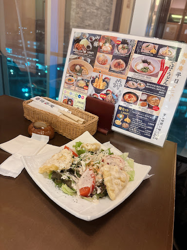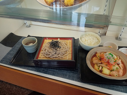初めて利用しました。湯がメインな為、食事は期待はして無いが どの様なものか......中へ入り窓側の席へ座る。外の景色が眺められる。 スタッフはバイトさんだろう方が 活気なく立っている。メニューは、それなりにある。値は、高い気もするのもあるが 価格的には 適切か? お冷、ほうじ茶はセルフ。サラダは美味しかったです。焼き鳥は、コ○ビ○感がある上、温かくない!!定食のご飯は、冷ご飯でビックリした!米が乾燥しきっており固く歯が割れたかと思う程で口の中から何回も乾燥した米を出す始末!! 天ぷらは、天つゆとおろしがありました。エビは、見事な程に見栄え良く厚手の毛皮のコート並に衣がありました。しかし、コレはあるあるなので逆に見事だったので凄いと思い細いエビを取りだし食べました。 1番あたたかい商品は、セルフの...