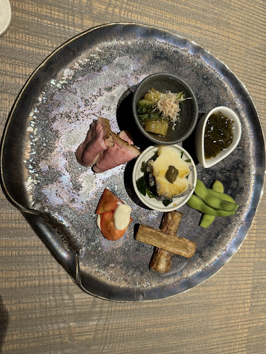 We ordered the 12,000¥ set. The food was decent, but unimpressive for the price, especially compared to other restaurants in Tokyo where you can find equivalent food for half the cost or less. The restaurant was empty except for us, had somewhat strange art, and played commercial American R&B music. The dish pottery was my favorite part. On top of the over-priced meal, we were charged 10% service fee, which I’ve never seen in Japan before - especially after service that was lackluster compared to the authentic Japanese hospitality we’ve received everywhere (“free” of expectation of a service fee). After an hour, I still hadn’t been served water so I asked for some. Our host began to crack open a bottle and I quickly interjected - not bottled water sir. My female companion does not eat meat, and as an alternative dish to duck, she was served cucumbers. “Omakase” implies trusting the chef, but after a call like that, I would be hesitant. Overall, there are many places that top this one for less than...