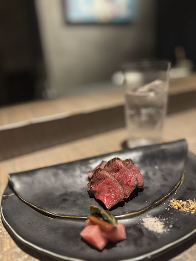 ■メイン 神戸牛のステーキが最高な火入れで最高の状態でいただけます 神戸牛でも赤身の多い部分なので全く油っぽくありません とても最高のレアステーキをこれまたおしゃれなアーモンド山椒塩でいただきます おしゃれですね
