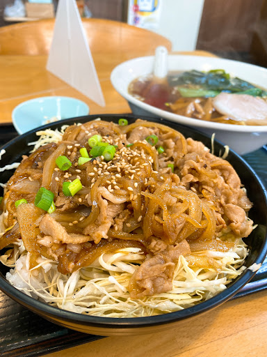 百々丼とは色々入った丼と言う意味で ご飯の上に千切りキャベツそしてその上に ニンニクの効いた肉と玉ねぎを甘辛く炒めたものがたっぷりのっています。 さすが近くに大学や高校が多いのでガッツリ ボリューミー。