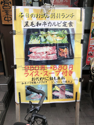 開店当初はなかったのですが、ランチタイムにハンバーグ定食と和牛カルビ定食の100円割引を交互にやっています(→2020年3月現在、他のメニューが割引対象となっていました)。 訪問時、和牛カルビ定食の割引でしたので、そちらを選択。加えて、ホッピーセット白をオーダーしました。こちらのお店は通し営業なので、午後の中休みを気にせずゆったり飲めます。 まず、ホッピーセット¥360-が、並の居酒屋より安い!中おかわりは¥210-ですが、それについても安い方。本当に良心的です。 飲みなのに、何で定食なのかというと、サラダのほか、ナムル、キムチも一応付いてくるからです。足りなければ、値下げしている低温調理のフォアレバーでも頼めばいいやという算段です。ほかにもツマミになりそうなメニューもありますし、ランチメでは焼肉メニューのハーフ(50g)も追加オーダー可能で、ちょっとずつ食べられます。 和牛カルビは6切れ来ましたが、薄いものでも5mm以上の厚みであり、一切れだけ筋っぽかったのですが、柔らかくてジューシーでした。そして何より、小皿で出てきたオススメのタレがよく合って美味しい。このタレは秘伝のタレの一つとして卓上にもあるのですけれど、ステーキソースに似たテイストのため、この肉にとても合っていると感じました。 ご飯は2回おかわりできるそうですが、飲みで訪問した身としてはそのような事は念頭になく、ナムルにコチュジャンを加えてビビンパ風にしたり、いろいろ楽しんでいるうち、ご飯も無事完食出来ました。 久しぶりの訪問でしたが、 和牛カルビ定食¥980-のところ¥880- ホッピーセット¥360- 中おかわり¥210-×2で¥420- 合計¥1660-に税足して¥1826- でおさまり、焼肉飲みにしてはリーズナブルで大変満足できました。 ただ、ホッピー飲まない人や、そもそもランチは飯だろうという方にとっては何のこっちゃという話ですよね。 ちなみに、瓶ビールは¥500...