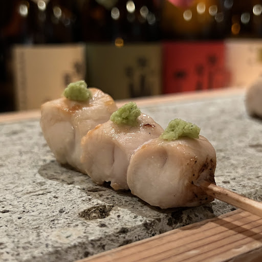 最初の串はささみのさび焼き。 ふっくらとしたちょうどいい火入れのささみは甘みも感じるもので、わさびの香りがよく合う。