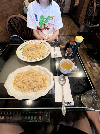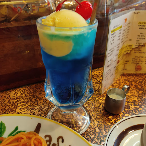 5分ほどで大きなピザ用のお皿にナポリタンが盛り付けられていました。ほどなくハワイヤンブルーのクリームソーダも提供されました。ナポリタンにはタバスコと粉チーズをたっぷりと振りかけていただくジャンキーな食べ方た適切です。何年ぶりかにいただくナポリタンも懐かしく、さらに10年以上ご無沙汰していたクリームソーダも...