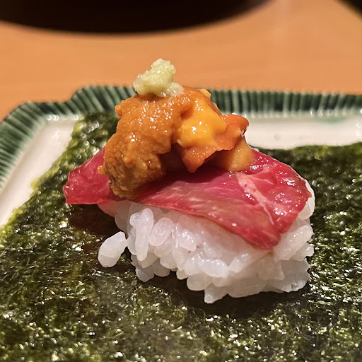 シャリの上に肉、そして雲丹を乗せたいわゆる「うにく」。 それを大きめの海苔に巻いて、手巻き寿司スタイルで頂くこちら。