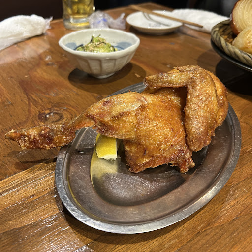 【名物】ひな鶏の半身揚げ: 大きなひな鶏は肉汁が溢れ焼きめが美しい✨そのままかぶりついてもいいですが、定員さんが食べやすいサイズにカットしてくれます。衣を付けていないのでカロリーを気にしている方にも安心!!名物料理に納得できるパリパリ食感です!!