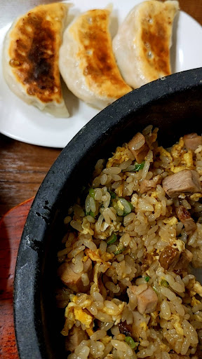 メニューは店先で散々悩んだが、中華料理に詳しいわけでもないので叉焼石焼炒飯(スープ付き)と焼き餃子。ランチだとセットみたいなのをやっていたが夜はそういうのはコース料理しかなく、一人なので頼めず。 熱い烏龍茶を入れてくれた。 熱々の焼石にチャーシューがたくさん入った炒飯。目の前でタレをかけてジュージューといわせながらかき混ぜられ、テーブルに香りが立ち込めた。 味はレビューでは賛否両論だが私的にはジャストな濃さであった。 非常に熱いが、そのおかげで終盤のご飯はお焦げとなっておりカリカリのご飯が楽しめる。 餃子の方も肉汁たっぷりで、薬味のほのかな香りと共に楽しめる。