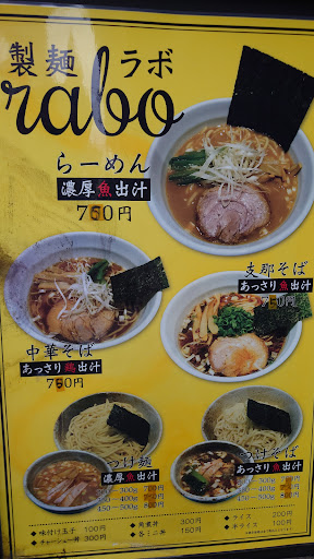 店名の「製麺rabo」の「rabo」は「Laboratory=実験室」の「labo」のつもりだったところ、スペルを間違えたそうだ。ただし職人気質の店主にとっては「r」でも「l」でもラーメンの味が変わる訳ではないので特にこだわらないらしい。