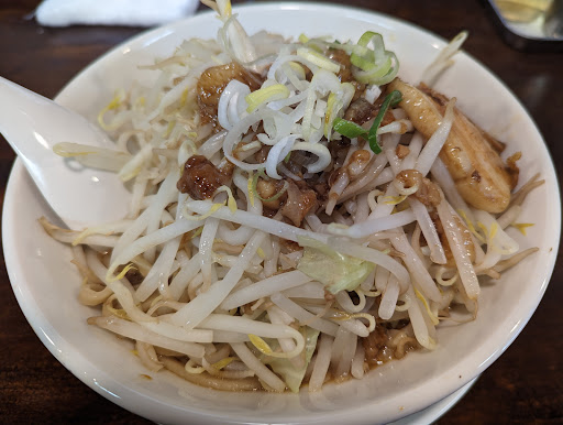 Read more街のラーメン屋らしく、薄汚いです。 麺の量は多く、小盛りでも300g入って750円ととてもお得でした。 中国人の作るボリューム満点で低価格の良心的な店でした。 医食同源 味薄めで健康的なラーメンでした。(まぜそばは不明) 背脂は、恐らくチャーシューから出た物を利用してると思われ、肉の旨味を蓄えた味付きという点が良かったです。 この時期に配慮してあるのか、少し酢を感じるスープでした。 他の〇〇系とは違い、食券購入と同時に、好みが有れば伝える。 調理が終わると、調理場から離れるので、店主の目を気にせずゆったりと食事ができました。 店主もこちらが話せば応えてくれる事と、納品業者が来た時は自らが表に食材を取りに行く等、他の〇〇系ではみられない低姿勢な店主だった。 他の〇〇系とは違い、堅苦しさは無かった。 チャーハンも提供しているそうなので、次はチャーハンでもと思いました。 臭いは危なそうですが、食中毒でも出せば、店側も色々面倒なので、その辺は心配無いと思います。昨夜〜1日経ちましたが、体調は特に崩れ...