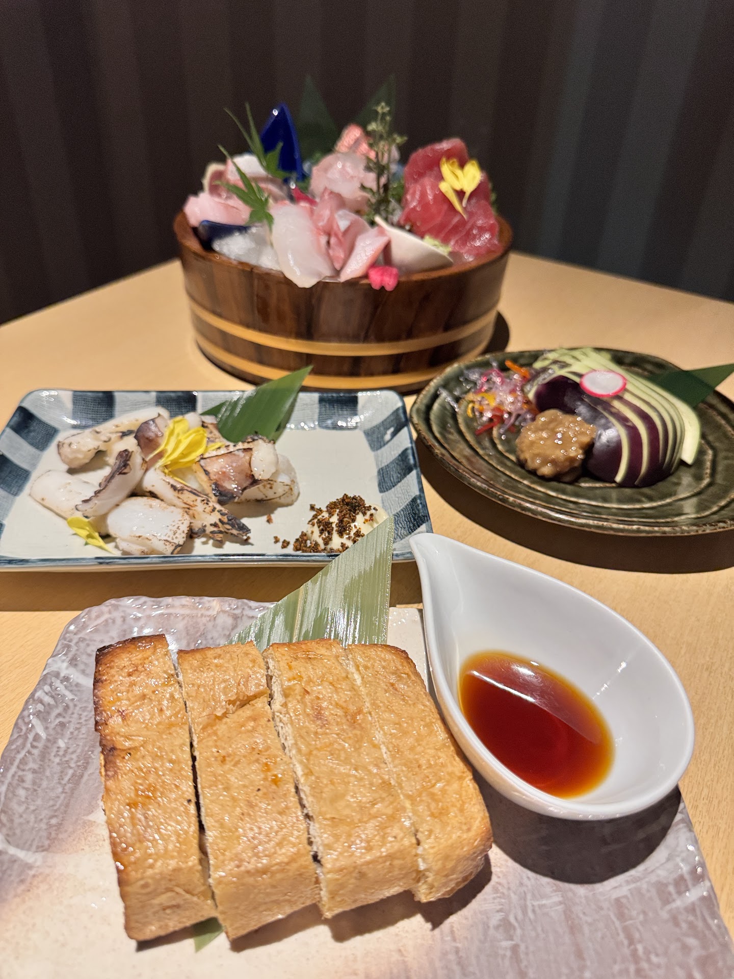 Read more越後酒房 八海山 浜松町本店にて、新潟の美食と銘酒を堪能してきました。豊富なメニューの中から特に印象に残った品々をレポートします。 鮮度抜群の海の幸と新潟名物 まず目を引いたのは「刺身7種盛り合わせ」。どれもがとろけるような舌触りで、鮮度の高さが際立っていました。特に、旬の魚は脂の乗りもちょうど良く、日本酒との相性も抜群でした。 新潟名物の「栃尾揚げ(納豆)ハーフ」は、外はカリッと香ばしく、中はふっくら。納豆の風味と揚げの旨味が絶妙に絡み合い、お酒が進む一品です。ハーフサイズがあるのも嬉しいポイントでした。 「紋甲烏賊下足塩麹焼き」は、塩麹のまろやかな旨味がイカの甘みを引き立て、香ばしく焼き上げられていました。プリプリとした食感も楽しく、いくらでも食べられそうでした。 和と創作の融合 「パリパリシーザーサラダ」は、シャキシャキとした新鮮な野菜と、パリパリとした食感のアクセントが楽しいサラダです。箸休めにもぴったりでした。 「レンコンチップス」は、薄くスライスされたレンコンがカリッと揚がっており、軽い塩加減でレンコン本来の甘みが楽しめました。おつまみにも最適です。 「水茄子の刺身」は、珍しい一品でしたが、瑞々しく、ほのかな甘みとシャキッとした食感が印象的でした。シンプルながら素材の良さを感じられる逸品です。 越後の恵みを味わうメインディッシュ メインとして注文した「へぎ蕎麦 中」は、つるりとした喉越しとしっかりとしたコシが特徴です。蕎麦の風味も豊かで、新潟が誇るへぎ蕎麦を存分に堪能できました。中サイズでもかなりのボリュームがあり、大満足でした。天ぷらも一緒にオーダーすると大満足な内容になります!! 「和牛炙り寿司(4貫)」は、軽く炙られた和牛の香ばしさと、とろけるような柔らかさが口の中に広がり、まさに至福の味わいでした。わさびがアクセントとなり、上品な脂の甘みを引き締めていました。 季節ごとに内容が変わる「四季の天麩羅盛り合わせ」は、旬の素材が丁寧に揚げられており、衣はサクサク、中はふっくら。素材の味を最大限に活かした逸品でした。 新潟の銘酒を堪能 ドリンクは、新潟を代表する銘酒「八海山 氷結」で乾杯。キリッと冷えていて、お料理との相性も抜群でした。その後は「ライディーンビール」や「麒麟山サワー」など、新潟の地酒をベースにしたドリンクを楽しみました。 また、「八海山の原酒で仕込んだ梅酒」をロックでいただきましたが、梅酒の甘みと原酒の奥深い味わいが絶妙にマッチし、食後にぴったりの一杯でした。「梅干しサワー」も、さっぱりとした口当たりで、途中に挟むとリフレッシュできました。 特に印象に残ったのは「サントリー碧」のソーダ割り。新潟の地酒と合わせて洋酒も楽しめるのは、幅広い客層に嬉しいポイントです。 総評 「越後酒房 八海山...
