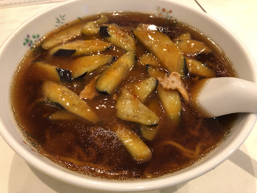 大量の薄切りのナスを油通しして、同じく油通しした豚肉の薄切りと共に、あんかけになっています。餡かけの味は、毎回微妙に異なるのですが、とにかく香ばしいです。そして、辛いです。とろみもあり、とにかく口内が火傷するくらい熱いです。