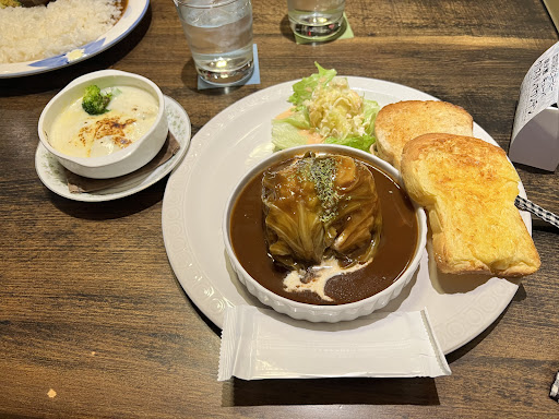 Read moreランチで利用しました。近所に住んでいたこともあり、このお店の存在は知っていましたが、当時は珈琲に興味がなかったので行ったことはありませんでした。 数年経ち、珈琲に興味を持った私はたまたま近くに行く予定があったので、利用させてもらいました。なんでもっと早く利用しなかったのだろうと後悔するレベルで美味しかったです。 ロールキャベツのコーヒーセットにしました。ロールキャベツは食べ応えがありました。連れがミニロールキャベツのセットにしていましたが、ミニでもファミレスで出てくるようなサイズでした。キャベツはとろとろで中の肉は肉々しい。トーストはバターの塩味が感じられ、ロールキャベツのソースに付けて食べました。不味いはずがありません。トーストもノーマルと雑穀パンの2種類がありました。珈琲セットはブレンドのみ。ストレート珈琲を飲むには追加料金がかかるとのこと。このブレンドがホントに美味しかった。舌にまとわりつく感じと甘い味わいでした。雑味もなくクリアで、酸味と苦味は少ない飲みやすい珈琲でした。プリンも食べたかったな。また近くに行くこと...