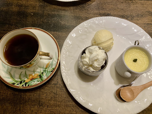 自家製バニラアイスは濃厚!(^-^)b コーヒーゼリーは、柔らかめの固さで甘さはなく その代わり上に乗ったホイップクリームの程よい甘さ( ◠‿◠ )b プリン(琥珀姫)には、カラメルソースではなく...