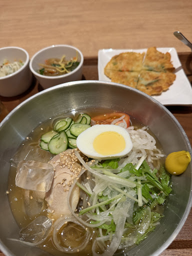 Read more2024.5.22オープンのお店です。 初訪問になります。 オープン週の週末だったせいか並び有りました。 並ぶ際に記帳する紙も無く 椅子に座って待つ感じでしたが スタッフも外に出て来ず どうすんだろって感じでしたが椅子に座ってると声がかかり入店 メニューを見ると結構いいお値段しますね😅だいたい¥2000位 ハーフ&ハーフが人気みたいですね ビビンバ&冷麺なんかの 三元豚サムギョプサルと牛カルビのセットをチョイス 提供は結構早め 5分かかってないかも😗 提供の際にお勧めの食べ方とか説明無し 結局チヂミはどうやって食べるのが美味しい食べ方とか解りませんでしたから普通に食べました。 味はまぁまぁ良かった 値段は高めで量は...