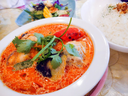 タイカレーは、この日はレッドカレーで、ココナッツミルクがよく利いていて、骨付きの鶏肉は箸でスルッとほぐれてしまうほど柔らかく煮込まれおり、また文字通り色々な野菜が入っているので、舌も体も喜びます。 こんなに満足感のあるタイカレーはなかなかありませんね。 こちらは、サラダとスープ付きです。 どちらもお値段は1,100円。