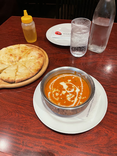 Read moreI ate some delicious food there that was rich in flavor and full of added spices. I ordered a normal spicy level and it was not spicy at all. I also had cheese naan that was not too greasy and perfectly made which added great to my food. I don’t remember the name of the dish I ordered but it’s in the picture. When I was seated at the table I was given a tablet to order on. I was an option to change the language to either Japanese or English and it had pictures of all the menu items. The only issue was I ordered water and it came out sparkling which caught me by surprise. Everything pictures: entree, naan, and bottle of sparkling water came...