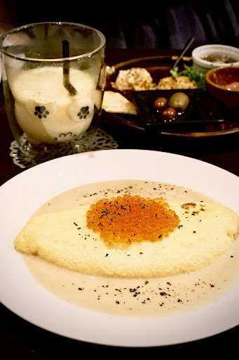 「ウニクリームオムレツ」 いくらがたっぷり乗ったオムレツ。シャバっとしていながらも濃厚なウニソースは家ではできないプロの味! 気づきましたか?とろふわオムレツにも肉球の刻印がしてあるんです💓めちゃくちゃかわいい🐱!
