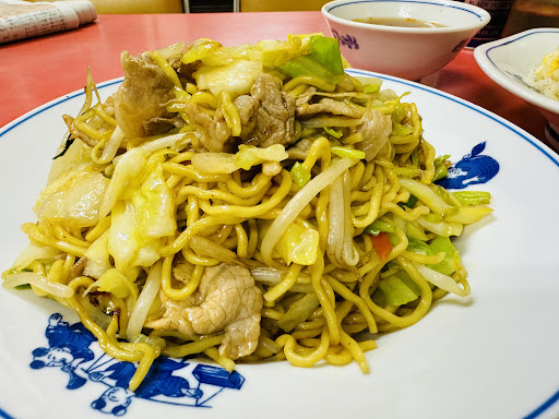 お店からの案内は控えめのため、決めたらお声がけする感じ。夜食ということもあり、肉入り焼きそば、半チャーハン、餃子をお願いしました〜。 ちょうど先客もオーダー後という感じで、天津飯の方、ワンタン麺、チャーハン、餃子の方が配膳され他の料理が見れて良かった。 そんな中、まずは半チャーハンとスープ、肉入り焼きそば、一呼吸おいて餃子が配膳されました。 おおーー、高くこんもりの焼きそば、淡い色のチャーハン、カリッと餃子の顔がうまそうー 肉入り焼きそばは、中華麺に豚肉、キャベツ、もやしと一般的でお味は見た目に反してソース味でした。 半チャーハンは、玉子、小さな豚肉、玉ねぎで料理の邪魔をしない淡い優しいお味でした。 餃子はカリッと、噛むと肉汁ブワッとでこれは美味しい♪ それぞれ、胡椒少々振ると良きです。
