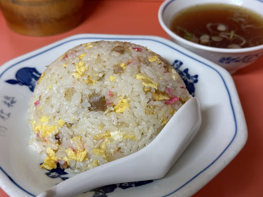 お店の奥まで進んで、カウンター席で「チャーハン」を注文。 厨房から中華鍋を振る音が聞こえてきたと思ったら、あっという間に、見ただけでほっとするような昔ながらのいい感じのチャーハンとスープが登場!
