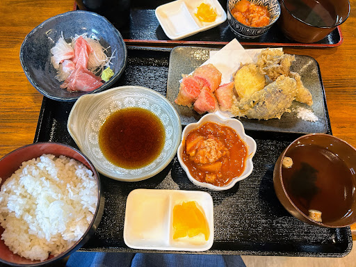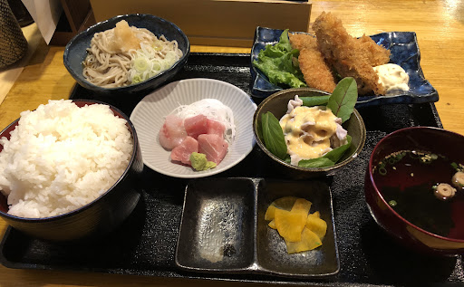 Read moreランチ利用で子どもときました。 ランチメニューで私は本日の魚膳A(定食)で子どもは天ぷら蕎麦でした。(実はBが食べたかった) 食べた感想 ランチなら定食がお得で良いと思いました。 チキンカツとエビフライがその日のメイン?でしたが私がエビを食べられないことを話すと別メニューで対応していただきました。(ランチの忙しい時間帯にありがとうございました。) 揚げ物が美味しい!エビと変えてもらったシシトウの豚肉巻き揚げはサクサクでタルタルソースとあいます。そもそもチキンカツが唐揚げくらいのサイズだと言う話だったのですが、定食は品数が多く、足りなくなる心配はなかったです。チキンカツがビッグサイズなら逆に辛かったかも(私は食べられましたけどね(笑)) とにかく、一品一品が美味しかったです。小鉢も手が混んでいて、少しだけ付いているおろしお蕎麦も少し甘めであと引きます、お刺身は少量でしたが二種類?どれも油が乗っていてご飯とあいます。 ちなみに写真のご飯は大盛りです、大盛り感があって嬉しかったです。おすましもあっさりでいて何かしっかり出汁を感じるお味でした。