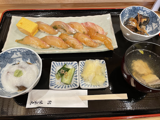 伊豆大島、岡田港の目の前にあるランチ営業をしているお鮨屋さんです。オーナーさんが漁師をされているので地魚が豊富です。今回は煮魚定食を注文。この日の煮魚は伊豆大島名物の”サビ”(クロシビカマス)で、注文が入ってから煮付けてくれました。煮魚のいい匂いに誘われ、定食が到着する前に「本日のおすすめ」から大島産のマハタ、ムツ、金目鯛を握りで注文。出てきたのはワキがキュッとしまった綺麗なお鮨で、ネタとシャリのバランスも私好み。魚はオーナーさんがご自身で釣ってきたそうで、どれも美味しい〜。特に2週間ほど熟成されているというマハタは、身がプリプリなのに熟成魚の旨味たっぷりで感動しました。ペロリと握りを食べてしまったところで、定食が到着。名物の”サビ”は脂のりよく、身もふっくらしっとり柔らか。濃いめ味付けでごはんがすすみます。そしてとにかく米がウマい。これでご飯おかわり無料は素晴らしすぎます!小鉢と味噌汁もついて大満足のボリュームでした。こんなに美味しい地魚が食べられるお店ができて大島ファン、魚ファンとしても嬉しい...