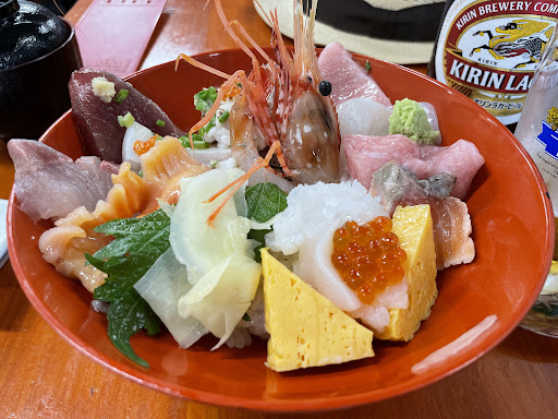 店構えからすると、業者さんにお魚を卸す問屋さんかと思っていましたが、店内で食事することも出来ます。その品質は高く、築地直送もうなずけるものでした。 つい2週間ほど前に、築地で海鮮丼を食べましたが、はっきり言ってこちらのほうが満足度は高かったです。値段はどちらも1000円ほどでしたが、ネタの種類の豊富さを踏まえると、ここのほうがいいと思います。 また駐車場も向かって右側に数台止められるので、余計な出費がなくて助かります。 接客は市場関係者独得のちょっとぶっきらぼうな感じはありましたが、あまり気にならなかったです。メニューも豊富で揚げ物から鰻など結構豊富でした。 確かに築地で食べるからこそいいんだというのもわかりますが、それは年に一回程でいいかな...