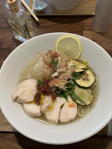 ✳︎23年夏の感想✳︎今回いただいた、夏場に登場した昆布出汁の冷たいラーメンは さっぱりしたコクのある澄んだスープに出汁氷、鶏むねチャーシュー3枚、ズッキーニ、シソ、ミョウガ、ドライトマトが乗って、爽やかな美味しさでした。スープも飲み干しました。(数量限定) 別添えの煮干し酢、意外な美味しさです。