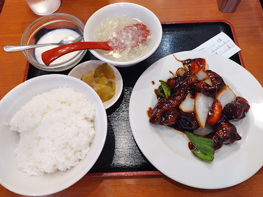 The set comes with the main (black vinegar deep fried pork), pickles, soup (something light with white pepper and tofu), and an almond jelly dessert.