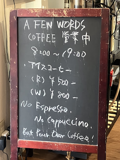 Hi just droping a reviews. Food i didnt order any so i tick one star since its ruin my morning day. must say atmosphere is cool i love the ambience. I love Japan and this is my first time in Japan so i decided to do coffee hoppin cause i love coffee and yes Japan of course one of the lovely country. Since day 1 i came here, every coffee place i went to is very kind and awesome. Barista's show how truly Japanese are, kind and warm and friendly to me . But this cafe(few words coffee) , before i came to this cafe, i am so excited to do my first morniny coffee so i went here. My experience is really bad. the first moment when i enter this cafe , the owner(i assumed ,old man) he asked is it for take over or to go so of course i wanna stay in for awhile and enjoy their coffee) and he said is it okay if only 30min if i want to sit down , its fine by me but since the moment he talked to me like that i already feel the energy is negative but i try to stay positive until i made an order and of course i will ask about coffee since i am paying for my drink as customer ( not to mention when i ask where is the menu list and hes tapping the menu list very hard) but im still keeping calm cause i really dont wanna spoil my trip/day ๐) . And i ordered a pour over coffee . its hot ( maybe i forgot to mention ice coffee cause my mind is already affected by his attitude) so when my coffee came, i am asking for an ice (not expecting like alot of ice , even a little i would appreciate ) but he pointed to me and said "its pour over coffee!" well of course i know its pour over and i only request for an ice abit but he talked in a rude way. If only he can say in a nice way i will appreciate since hes old cause i respect people especially when they are elderly people ๐ฅน. So now i know this cafe is NOT WORTH to visit (unless your patience level is 5star ๐) Since i came here in Japan, i have no issue with any cafe i went to but this 'Few Words Coffee' leave a mark on my trip as the rudest...