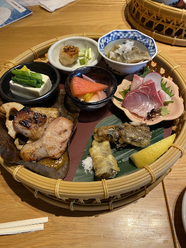 We had the Summer Bamboo Basket Feast Set pictured below which blew our minds. Included a lovely salad starter with fruity vinegar type dressing and a wappameshi (egg and crunchy veggies mixed rice - superb). Our second order was another specialty, Steamed Oshan Pork with 2 dipping sauces and tuna sashimi over grated daikon. A dessert of matcha Bavarian cream which was an absolute knockout to close out the meal. All for the very underpriced 5200 yen. Definitely returning here. Highly recommended. Expect long lines...