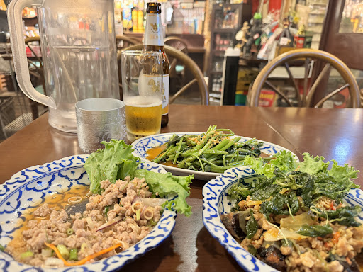 厨房では、本場タイ出身シェフのワンオペ。 壁面には、コミックスが多数置かれ、駄菓子屋で取り扱っているような玩具などがディスプレーされている。 反対の壁には、「たばこ」「バヤリース」などのホーロー製の看板やネオン看板などが掲示されている。タイというより昭和レトロな感じ?笑