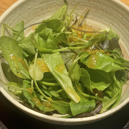 まずはサラダから。 サラダにも玉子焼きがかかってて さすが焼き鳥屋さんのサラダ。 さっぱりしたドレッシングと玉子が しっかり絡みつきます。