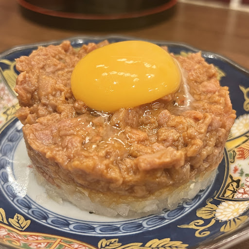 ⭐️ 旨辛タンユッケ 980円 刻み大根の上にユッケ、卵黄が乗っています。 ユッケに使用されている牛タンは、真空調理法で処理されているため新鮮で香りや旨味が閉じ込められ、とても美味しい。 玉ねぎのみじん切りのシャキシャキ感がアクセントになっています。