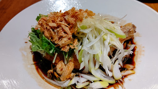 ・蒸し鶏レッグ(骨付もも肉一本) … ホロホロという言葉では いささか足りないこの蒸鶏は、 骨までも舌で押さえれば潰れ るほど柔らかく、私は骨まで 頂いてしまいました。 甘みのある醤油ダレにネギ油、 薬味は白ネギにフライドオニ オン。 塩気が程よく、ペロリと頂戴 しました。