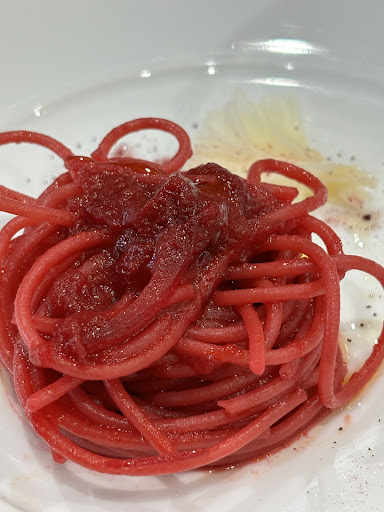 美しいレッドパスタ❗️トマトとビーツが練り込んであり、爽やかな酸味が病みつきになります。パスタの旨さ、食感に感動しました🇮🇹