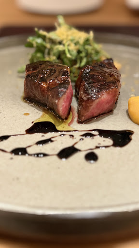 ○Il Secondo Piatto 炭火と熟成の煮り 京都中勢以(エイジングビーフ専門店)の但馬牛ミスジ8週間熟成の炭火焼き。人参のピューレ